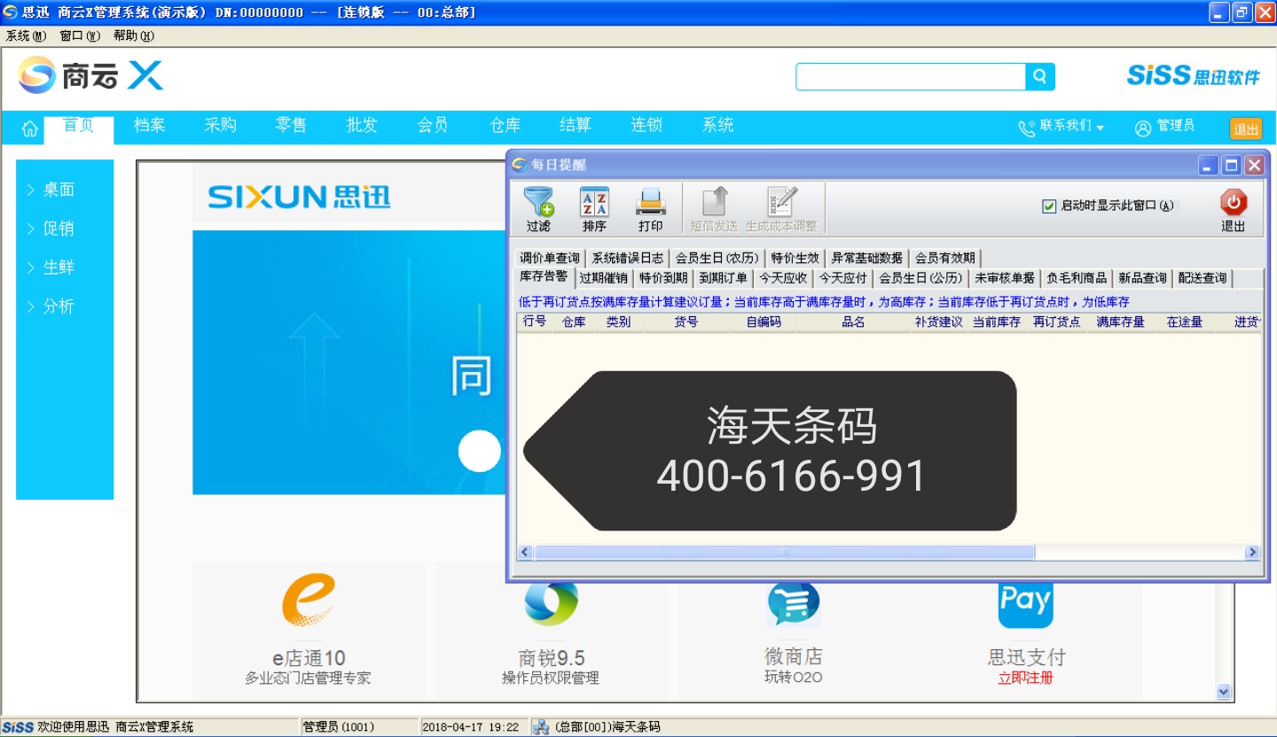 零售管理: 卖场监控,流水查询,收银对帐,缴款单,日结,成本重结转,毛利分析,各类促销,促销报表,拾零管理,销售分析。